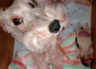 昨晩から陣痛が始まり、日付けが変わり赤ちゃんが下りてきてるけど逆子で尻尾が触れるだけで降りてこないので動物病院へ行き陣痛促進剤を打っても全然ダメで陰部を切開するかどうかを獣医さんに言われましたが、それでは確実に出てくる保証もないので、帝王切開をお願いしました。 子犬は3頭入ってて・・・3頭と数が少なかったせいか大きさはさほど大きいわけでもないのですが、シュナウザーやレイキーの赤ちゃんのように丸々としてて、出れなかったようです。降りてきた1頭目は大丈夫でしたが、次に降りた子が胎盤から...
