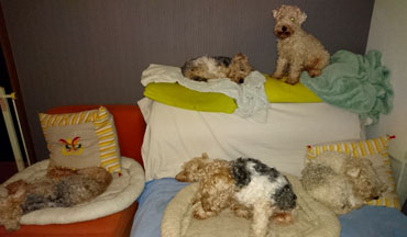 夕方の遊び時間が終わり、子供たちはクレートに入り大人の一部もクレートで寝て、ソファーの好きな子たちの画像です JUGEMテーマ:ワイアーフォックステリア