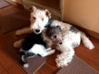 生後2か月過ぎのワイアーフォックスのペイジ君が神戸へ旅立ちました 行ってすぐのペイジ君とトッティ君 そして翌日 4日目のふたり JUGEMテーマ:ワイアーフォックステリア