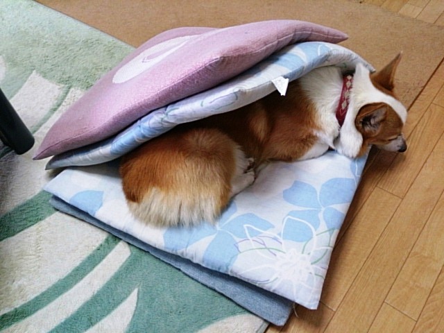 JUGEMテーマ:コーギー 11月7日(木) 今日は朝から冷たい雨が降っています。 なのでヒナノは、大好きなお散歩無しで、しょぼぼーんとしてます。 家の中でのボール遊びも飽きて(お互いに)、私は家事の続きを。 さて、ヒナノは何をしているかな・・・やけに静か。 いつもだと、見張られているような視線を感じるのに、気配がない。 座布団と座布団の間に入り込んでいました。今日は寒いもんね。 ヒナノサンドウィッチのできあがり♪ 可愛いすぎて食べられましぇーーん