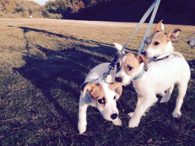 JUGEMテーマ:ジャックラッセルテリア 生後100日目 今日は、近所の ”東星ふれあい広場” に45分ほど散歩に行きました。 新池の横の程よい広さの芝生公園です。 自宅へ帰るなり… 「ワタシたち… 疲れてもうダメ」 東星ふれあい広場にて パンダ「何でもかんでも、かじっちゃうよ〜」 ヒメ『とうちゃん、木の根っこは色んな匂いがするよー」 パフ「オマエたちは、まだ抗体が弱いから長くソコに いちゃだめだよ!」 パフ「おい!サザンカの花が咲いてるぞ!クンクン...