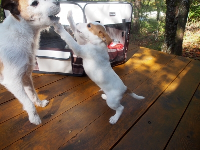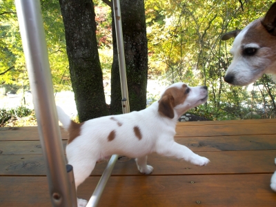 JUGEMテーマ:ジャックラッセルテリア 生後60日目 今日はヒメちゃんです。 いろいろと風景の色が変わってきたみたい。 でも、ワタシ白黒で見えるから微妙〜 もうちょっと近くで楽しみたいんだけど、高くて ちょっとコワイわ。 パパー!テーブルの上に何かあるよ! パフ「コレ食べれるものかなー?」 ヒメ「なんか ここから臭うよ。」 クミン「パパ気にするからだめよー。」 ヒメ「でもパパのこと大好きなんだもの。」 犬の挨拶は、年上からお尻の匂いを嗅ぐのがルールです。あしか...