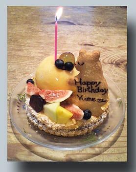 8月26日(火) 久し振りのお気楽ランチでの出来事 カメラもPCも具合悪く、ブログも長〜いことお休みしてすっかり怠け癖がついていたのに、すんなりと記事アップしたくなった!サプライズがありました。携帯から四苦八苦しながらのアップです。 → だって、こんな可愛いケーキ、世界に一つでしょ! クマさんとフルーツの絶妙なコラボ。 丸ごとモモ、イチジク、ブルーベリー、パイン、葡萄 ケーキの部分もアーモンド風味のタルト、クリーム... u〜とろ〜り全部相まってお口の中は ?おとぎの国? お友だちか...