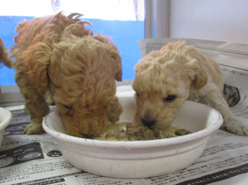 JUGEMテーマ:トイプードルの子犬 ごはんタ〜イム 4兄弟、2人ずつに分かれて上手にごはんタイムです こっちの二人もおいしそうに食べてます どぉ? お嬢ちゃん、おいしい? 『おいちい』 超〜かわええ〜 ん〜 そ〜かそ〜か いっぱい食べとき 隣のボクちゃんもおいしそうに食べとるね(笑 &nbs...