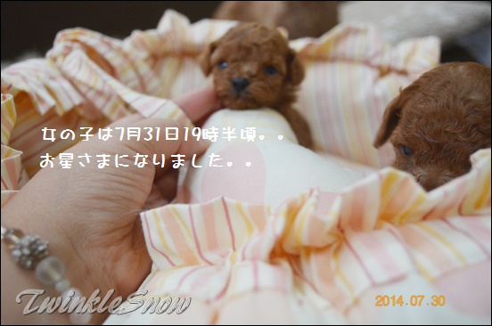 JUGEMテーマ:トイプードルの子犬 TWINKLESNOW犬舎(PUTIDOG☆NET)では ティーカッププードル、タイニープードルのブリーディングも小規模ですが行っています。 当犬舎のまぁしゃ、メリーも今年で引退となりました。 みぃしゃが現在子育て真っ最中です。 今後は、信頼できるブリーダーと共に共同繁殖で行っていきます。 トイプードルの方もどうぞよろしくお願いいたしますm(__)m まずは、ルルドと交配していく子達を紹介しま~す^^ もう2歳ですが、良いママになれるといいな^^ この子が産ん...