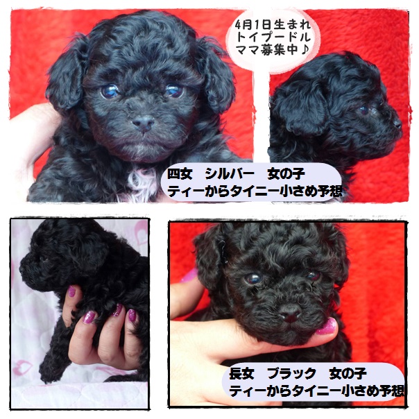JUGEMテーマ:トイプードルの子犬 4月1日生まれトイプードル(Tからタイニー予想) 長女ブラック 800g 次女プラチナシルバー750g 四女プラチナシルバー650g四女ちゃん 盛岡市S様に決まりました(^.^) 明日お引渡しです☆ ビビビーっと来ました方は 詳細をお問い合わせください。 facebookもよろしく☆http://www.facebook.com/pomepoo ぽちっと応援お願いします(^.^)