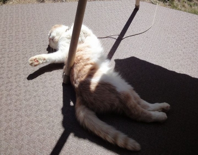 JUGEMテーマ:スコティッシュフォールド 暑いです。暑い。 日陰で寝るくらいなら家の中の方が涼しいんですけどねぇ・・ 上から見ると こんな感じです。 暑くて顔つきが悪いッス。