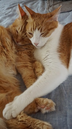ちぃ&サク サクちゃんは、基本ひとりでも平気なのですが 寄りかかれる何か(枕、クッション、人など)が欲しいタイプ。 ちぃちぃはサクちゃんのいるところにスッ現れ、側で横になるので 枕にちょうど良いようですw 昨晩のニャンズ さすがに暑くて寄り添ってはおりませんでしたが シンクロしてます(笑) 最近はわっこーを除く4ニャンがヤマダ部屋で寝る時間が増えてきました。 ちぃ・サク・ニコはベッドの上、カカ太朗は本棚の...