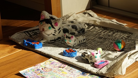 先日のお打合せにて Sちゃん「これね、夏休みの宿題。」 もう終わったの? スゴイ!(←最後の3日でやるタイプ) お母さん猫と子どもの猫? 「うん」 わぁ! ゴハンとお水とオモチャもある! 「えへへ」 この猫さんのモデルは誰かな? 「………華ちゃん」 ↑お昼寝中の華ちゃん Sちゃんは生まれた時から華ちゃんと一緒。 お家のそこかし...