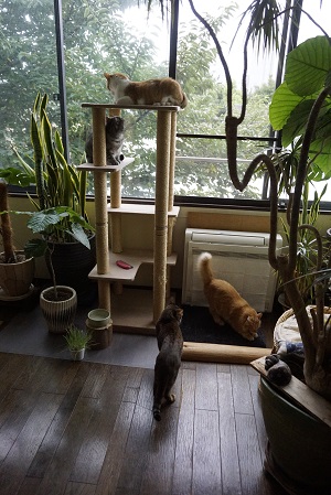 事務所で仕事をしていると セミナールームにいる、桜舎5が騒がしい。 なになに? どしたどした? 目撃していた にいつまさん曰く サクちゃんがニコを追いかけまわし、 カカ太朗が助太刀に入ったとか。 興奮冷めやらぬ、サクちゃん 爪研ぎバリバリーw ニコはタワーに避難したものの あー、びっくらこいた 上にはちぃちぃがいて、シャーしてた(笑) ボク、ここにいただけなんですけど… だよねーw なんか...