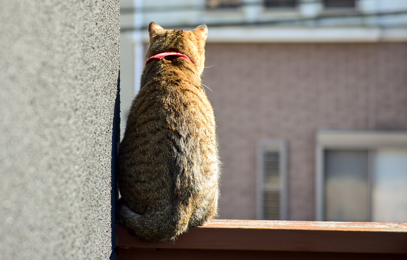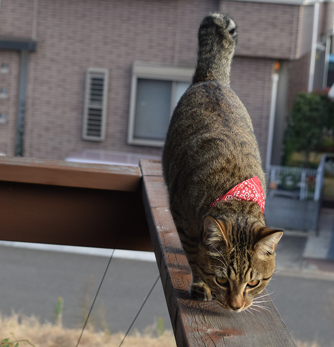 JUGEMテーマ:キジトラの猫 脱走して手すりをわたってみたけれど降りられるところがなかった。