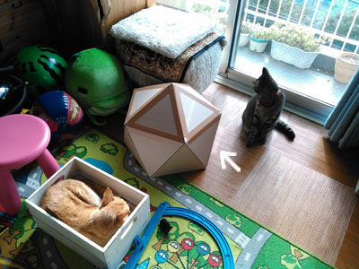 夫がきれいな段ボールを 三角形にたくさん切って、 つなぎ合わせて 段ボールハウスをつくりました。 「シロクマの家かしら?」 無駄に発揮されるクリエイター魂…。 もう高い所に登れない、 なんちゃんのための家なのだそうです。 「段ボールね、紙の匂いってそわそわするの。」 せっかく作った力作ハウスで きいたんに用を足されないよう、 お城の中には綿のマットを敷きました。 ちなみに、なんちゃんは入らず ...
