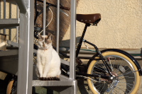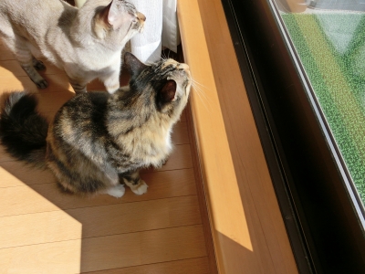 朝、洗濯物を干すときが、 ネコさんたちの 一日一度のベランダタイムです。 もうすぐ開くニャ。 勢い良く飛び出すのは、ねね。 そのあとを、あいがゆるりと。 スリスリ、ゴロゴロ・・・やっぱりこれをやらニャくちゃ。 ジョウロの中の水を、手ですくって・・・。 おいしい〜? あいは一度はここを歩きたい。 一度歩くと満足するようです。 そろそろ入ろうか? まだ家に入りたくない時、 ねねは、室外機の後ろに隠れちゃいます。 もっと遊...
