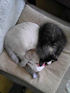 ネコさんたちが、まだ小さかった頃、 ハートになってる!!と、見つけたのは次男。 すぐにカメラでパチリ。 私のプロフィールにも貼ってあります。 とても好きな写真です。 また、あくる日。 うん、ハート、ハート。 さらに、あくる日。 う〜ん、これはちょっと厳しいか・・・。 いやいや、可愛いから・・・ここはひとつハートで。 ハートでお願いします