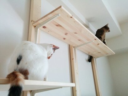JUGEMテーマ:にゃんこグッズ 今日は、ディアウォールを使った自作キャットウォークを紹介いたします。 色々な方のブログなどを参考にさせて頂きました。 おっかなびっくり登頂したの図 ディアウォールとはこういうものです。 二つセットで、ツーバイフォーの材木を天井と床に突っ張らせる構造。 傷を付けずにキャットウォークや棚を設置できます。 床と天井の高さを測り、マイナス4mmで2×4のベイマツをcut。 付属品に、木材の長さが足りなかったときのス...