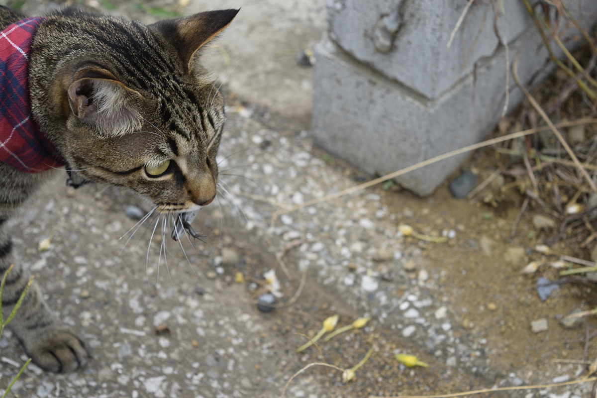 トカゲを捕まえました。 遊ぼうと思って車の下に連れていったらタイヤの下に逃げられました。 でてきてくださいよー。 気が付いたら小学生がもってきた縄跳びで遊んじゃっていたじゃないですか!! 小学生が帰ったあとにバッタをとって楽しみました。 バッタにも飽きたのでいったん家にもどって春太とでも遊んでやろうかと思ったのに、地震におびえた春太はどこかに隠れてしまってでてきません。 なので虎は再びお散歩です。今度は...
