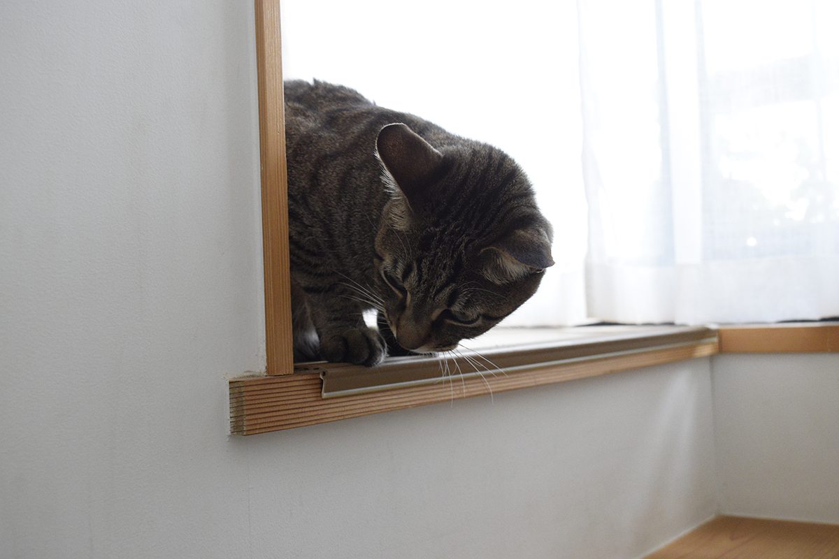 聖域消失 前編 → Click 人間が虎を呼ぶのでキャットウォークの方に行ってみました。 な、な、なんと…へっぴり腰の春太が虎の唯一の聖域、階段上のキャットウォークを歩いているじゃないですか?! このエリアのキャットウォークは昨日まで虎しか歩けなかったはずなのに…。 春太がウロウロし始めました! そこは虎がお外の鳥さんを見張る定位置ですよ! 春太昨日までここのキャットドアは硬くて通れ...