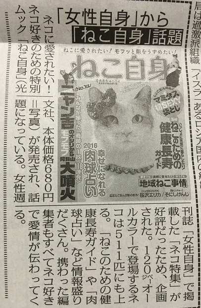 JUGEMテーマ:MIX猫 「女性自身」から「ねこ自身」がおととい発売になったそうです。 今朝、届いたスポーツ新聞の記事で知りました!! 本屋さんに行ってみると、ありました! 買っちゃった!! 「ねこ自身」!! 袋とじのコーナーもあるのです。 面白い企画だなぁ〜って感心しちゃいましたよ〜。 『ねこ自身』では、あなたが撮った“奇跡の猫写真&動画”を募集中! だそうです。 紅白、見てますか? あと4時間足らずで来年ですね。。 今年一年、早かったです〜。 葉っぱん、すっ...