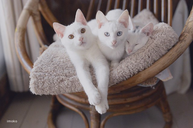 JUGEMテーマ:MIX猫 Nikondf/Ai AF Nikkor 50mm F1.4D 白猫兄妹。 三匹一緒にいつも仲良しでいます。 左からウド、さくら、小梅。 それぞれに個性が強く出てきていますね。 性格もみんな違って面白いです。 一番甘えっ子の向かって左のウドくんはまるで犬のように、ベタ〜ってしてきて、 顔を舐めまくります。とっても嬉しいですが、猫の舌はザラザラしていますよね。 だんだん痛くなってくるのです。(;´∀`) それでもゴロゴロしながら舐めてくれるウドくんはとっても愛おしい!! 今日もすっごく風の...