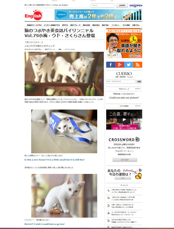 JUGEMテーマ:MIX猫 読んで身に付く英語勉強法マガジン | Cheer up! English このサイトの中の猫のつぶやき英会話バイリンニャルというコーナーに、 我が家の白にゃん兄妹が登場であります。 猫達と一緒に楽しく英語のお勉強を致しましょう!! 猫のつぶやき英会話バイリンニャル Vol.79小梅・ウド・さくらさん登場 ・・・・・・・・・・・・・・・・・・・・・ みなさま、今回の大雨、大丈夫でしたでしょうか? 今日、テレビの信じられない状況の映像にただ、ただ、心配することしかできなくって。。。 どう...
