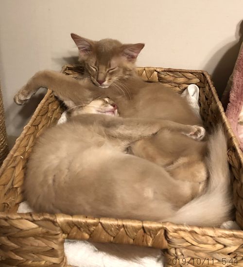 JUGEMテーマ:ソマリの子猫 自分でもビックリしているのですが、 9月15日に風邪を引いてから 良くなったり悪くなったりを繰り返し 未だに治っていません。 ということで、トイレに起きたタイミングで 撮影した文珠くん(上)と美勒ちゃん(下) 眠りに落ちる前には お互いに毛繕いしたりガブガブしたりして ここで仲良くしていたのでしょう。 という、この1枚だけです。 いつもだったら、お世話係2のフォルダーから Instagramで使わ...