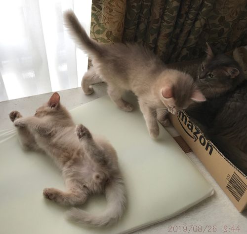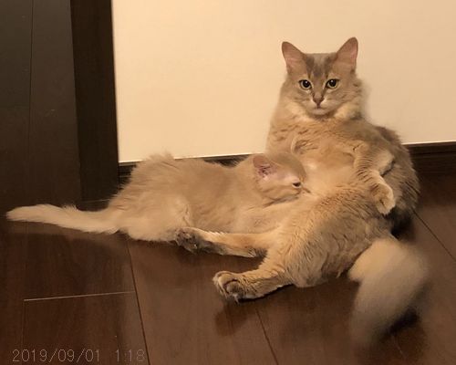JUGEMテーマ:ソマリの子猫 朝のまったりタイム。 朝ごはん食べて、ひと暴れして、あとは寝よっかな。 丸見え文珠くん→美勒ちゃん→お祖母ちゃん。 文珠くんとお祖母ちゃん。 ママ以外のオトナ猫たちにも 甘えに行くことが増えてきました。 お昼寝は、昨日文珠くんがいた場所に美勒ちゃん。 そのすぐ下、美勒ちゃんがいた場所に文珠くん。 右端にお祖母ちゃん...