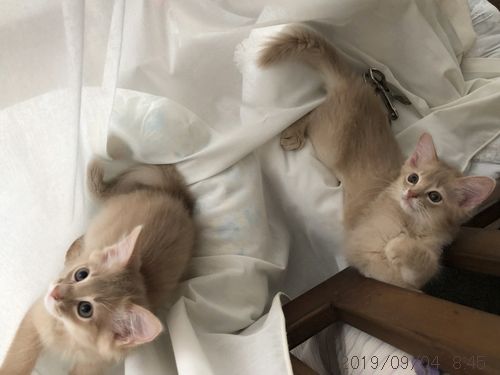 JUGEMテーマ:ソマリの子猫 今日は窓辺から聞きなれない音がすると思ったら 天蓋風に掛けてあったボイルカーテンが ふたりに落とされていました…orz ←懐かしの絵文字 あーあ、そこはオトナ猫たちの憩いの場だったのに。 すっかり仔猫の遊び場になっていました。 悪いことしちゃったあとは、得意気。 人間のこどもと同じですね。  ...