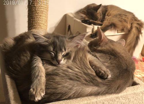 JUGEMテーマ:ソマリの子猫 みんなバラバラで休むときも増えましたが 一緒にいるのも好きみたい。 箱の中は、左下がうりちゃん、 真ん中がコアちゃん、 右上がもみちゃんです。 リオちゃんとママ。 リオちゃんが抱き枕になっているのかと思ったら ママに腕(肉球?)枕してもらっていますね。 開始時のポジションで左から コアちゃん→リオちゃん→もみちゃん。 この4...
