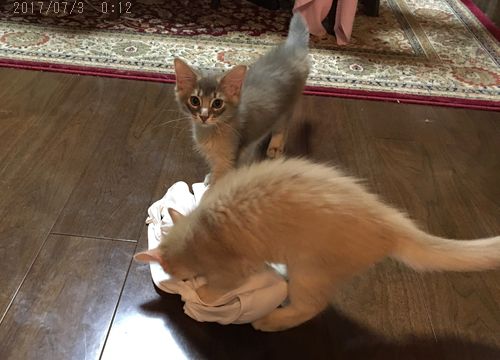 JUGEMテーマ:ソマリの子猫 今朝も暇を持て余している麗くん。 朝の時間帯は忙しいから 麗くんが満足ゆくまでは遊んであげられず…。 暇・暇・超暇オーラを放っております。 そこで、我が家で一番若い麗くんのお父さんを 遊び相手にどうだろうと試したところ…、 麗くんは遊んで欲しそうだったけど、 パ...