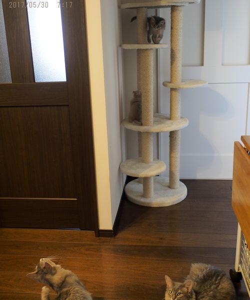 JUGEMテーマ:ソマリの子猫 毎朝繰り広げられる朝食の後の大バトル。 その後の休息の場に2匹が選んだのは、 つい先日、麗くんが上れるようになった高いタワー。 今朝は桜花ちゃんも登れるようになって、 2匹で仲良く眠っています。 今日は、桜花ちゃんのお目目の腫れが 思ったように引いていない気がしたので 再び病院へ行きました。 前に通っていた動物病院は 度々待ち時...