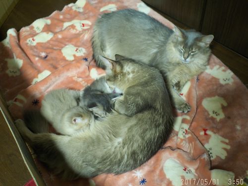 JUGEMテーマ:ソマリの子猫 昨日作ったバリケードの中で子育て中の雪倉。 自分の母親と子供に囲まれて、幸せな子だなぁ。 最近、頻繁に自分の母親を毛繕いし始めたのは 『この前みたいにさぁ、 そろそろ子育て代わってくれない?』 と訴えているのかもしれません。 バリケードの外に出たい桜花ちゃん。 麗くんは、こんなことしません。 彼は与えられたスペース...