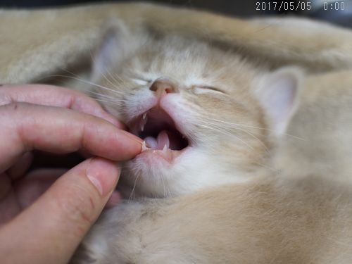 JUGEMテーマ:ソマリの子猫 眠っている桜花ちゃんにご協力いただき 皆さんに「こんなに歯が生えたよ!」を 是非、見ていただこうかと企画。 「あ〜ん」 前歯も生えつつあります。 白くて透明度の高い美しい歯です。 茶渋も加齢による摩耗もなく…、 若いって素晴らしいね! いつも体重を量っていた箱が小さくなってきたので 今朝から...