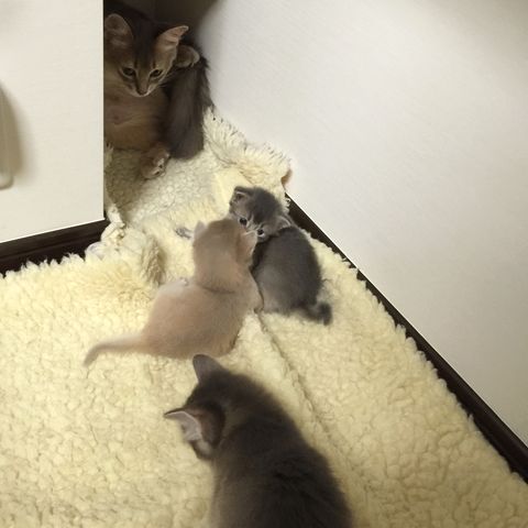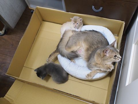 JUGEMテーマ:ソマリの子猫 いつも通りニッチから連れ出して ベッドの上で授乳させた朝の7時半。 そして、その1時間後には お部屋係2の仕事部屋にいる雪倉ファミリー。 ついに雪倉ママがお引越しをしました! お引越し先は人間には決められないので (絶対に言うことを聞いてくれないので) 雪倉ママが指定した場所に 猫ベッドを持ってゆき整えてあげます。 だけど、生後10日ほどの仔猫ならまだしも もうすっかり仔猫たちもそれなりに成長し 猫ベッドなんて簡単に乗り越えてしまうので ...