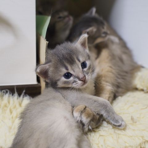 JUGEMテーマ:ソマリの子猫 一番大きくて一番活発な長男エツ君。 エツ君は『イケメン』担当ですよ。 やっと懐いてくれたシャイな次男ブン君。 エツ君(上)とブン君。 ブン君は『キュート』担当です。 そして人懐っこくて賢い末っ子カコ君。 カコ君は『チャーミング』担当です。 カコ君の仕草がとっても可愛いの。 上の2匹はカコ君(左)とエツ君(右) 下に写っているのはブン君 仔猫た...