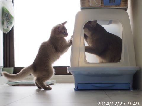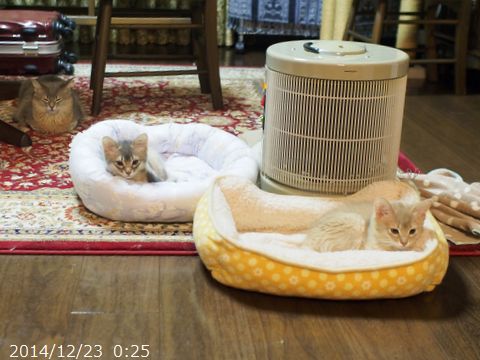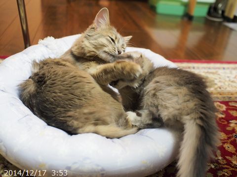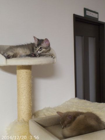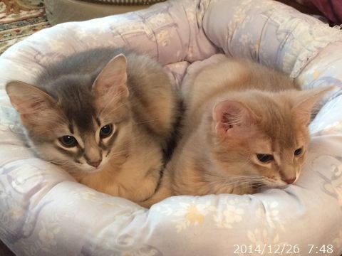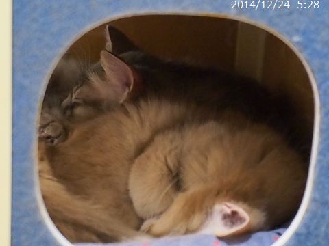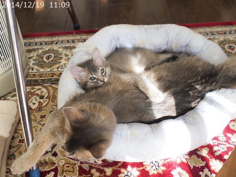 JUGEMテーマ:ソマリの子猫 寒い日だったので、2匹一緒にお休み。 朝ご飯のあとも一緒にお休み。 先日22日が、朔旦冬至だったそうで あっという間に日が落ちるこの頃です。 大体16時半頃に日の入ですが、 西側に連なる建物のせいで 16時には太陽が見えなくなります。 少しでもたくさんの光を浴びて 健やかに元気に成長してね。 とっとこ、立ち飲みの図。 眠っていたママを見つけて 甘えています。 この日、ハムちゃんは4g増えて1,321g...