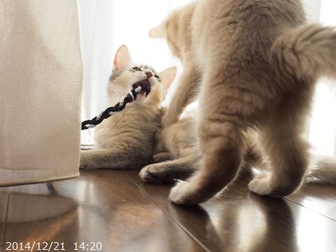 JUGEMテーマ:ソマリの子猫 とっとこだって毛繕いしてあげます。 タワーの上で2匹プロレスごっこをした後、 ハムちゃんの毛繕いを始めたとっとこ。 だけど結局プロレスごっこに戻ります。 この日は、撮影日和だったので 100枚以上撮りましたが、 一枚も「これ!」というものがありません。 せめて普段の2匹の雰囲気だけでも 伝われば良いのだけど。 ハムちゃんの一人遊び。 トンネルとトンネルの連結部分から 無理やり内部に入り込み ハムちゃんを襲う と...