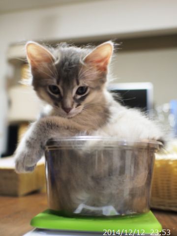 JUGEMテーマ:ソマリの子猫 狭いってのも なかなか良いものだね 暫く前から、体重測定のとき スーパーでトマトが入れられている容器に 仔猫を入れて量っていましたが、 それもそろそろ限界かな。 重心の関係で、少し動いただけでも すぐに容器ごと転がっちゃうの。 キッチンにお菓子が入っていたと思われる 小さ目のカゴを見つけ 今日から新しいのに代えました。 猫の本能的にドンピシャだったのか 仔猫たちの抵抗が小さい!! この日の体重は、 ハムちゃんが...