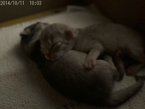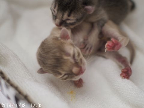 JUGEMテーマ:ソマリの子猫 今日は、ママが産箱の中で寝てしまい 仔猫たちは思う存分ママと一緒にいられて 最高にHappyな日となりました お腹いっぱいになるまで飲んで寝落ちする幸せなフォーン君。 熟睡モードに入ったフォーン君と、まだまだ飲むぞーッ!なブルーちゃん。 飲めるときに飲んでおかなくっちゃだね☆ その後、親子みんなで眠りにつきました。 しかし…、幸せな親子の時間を引き裂く魔の手が!!! そうです、体重測定の時間です! 無理や...