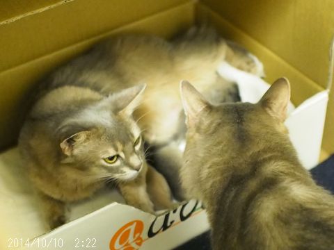 JUGEMテーマ:ソマリの子猫 朝、動画を撮りました。 ほぼ動かない動画で、何を映したかったのかというと、 目を開けたまま眠るブルーちゃんの姿です(笑) 夜はリビングにキャリーケースを移し パパやお姉ちゃんをはじめ色々なおとな猫たちと触れ合いました。 基本いつもオムツ姿のパパと顔を合わせ、 お姉ちゃんに毛繕いなどしてもらっていました。 暫くすると、仔猫たちにも人間の赤ちゃんでいう 人見知りの時期のようなものが来るのですが、 その前にママ以外の猫さんたちと...
