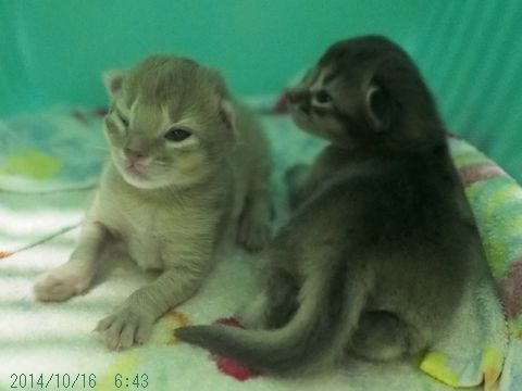 JUGEMテーマ:ソマリの子猫 産箱の中。 ブルーちゃんを枕に眠るフォーン君。 今度はフォーン君が枕になって、その上で眠るブルーちゃん。 幸せそうだなぁ。 眠っているときも幸せそう。 寝ていても可愛い仔猫たちですが、起きているときも勿論可愛いです。 フォーン君、可愛いぃぃぃぃぃ ブルーちゃんも、可愛いぃぃぃぃぃ ブルーちゃんの口元がピンクに見えるのは、 多分ちっちゃくテヘペロしてるからだと思います。 そんな今日の体重測定。 フォー...