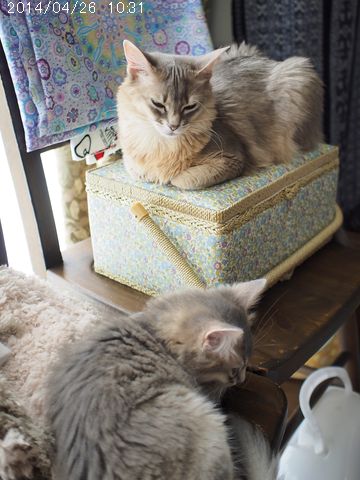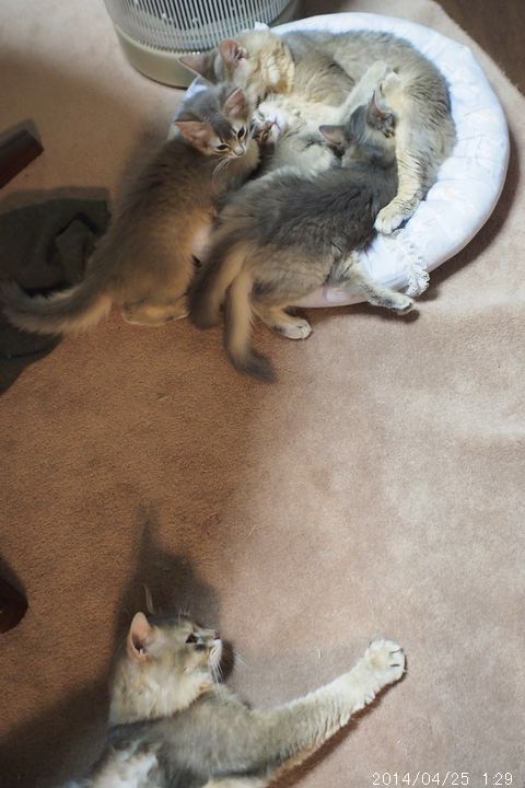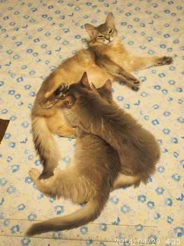 JUGEMテーマ:ソマリの子猫 お裁縫BOXの上で香箱を組むママと そのすぐ側で同じように香箱を組んで休む雪倉。 もうすぐ生後3ヶ月ですが、まるで赤ちゃんみたい。 同じころシェルフの上でプロレスごっこに興じる水晶(左)と燕(右) どちらかが一方的に強いということはありませんが、 この時は、水晶がやや劣勢ですね。 これが楽しくって毎日するのだから、仔猫って分からない。 雪倉が香箱を組んでいた椅子で ママのおっぱいを吸う燕。 お顔を見ると『超☆満足』したよう...