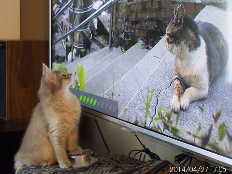 JUGEMテーマ:ソマリの子猫 今朝も熱心にテレビを見る水晶さん。 テレビに近づきすぎだと思う。 この猫さんが気になるのかと思いきや、 後ろで風に揺れていた芋科の植物の葉っぱが気になっていたみたい。 動いていれば、何でもいいのかな〜。 そのうち猫たちが喧嘩をするシーンになり 仔猫防衛のためか(?)ママも参戦。 水晶は、後ろをチェックする係です。 それを側で見守る雪倉。 テレビの画面の向こうでも喧嘩は怖いね。 ...