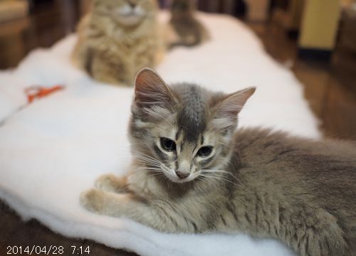 JUGEMテーマ:ソマリの子猫 布を敷けばやって来る〜♪ 参加型猫さんズ。 ママよりも仔猫たちの方が大きく見えています。 雪倉の上に乗っかっている水晶と気にせずお乳を飲む雪倉。 前日に出来上がった猫ベッドのサイズが小さかったような気がして リベンジしようと布を広げたところでした。 雪倉(中央)とパパに毛繕いされている水晶(右) 家族だと認識があるのかどうか分かりませんが、 パパは仔猫たちをよく可愛がっています。 左から雪倉→水晶→パパ。 雪倉の体重は、1,4...