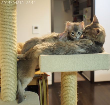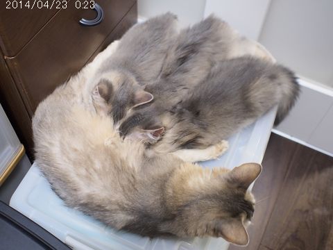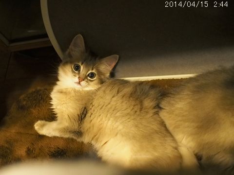 JUGEMテーマ:ソマリの子猫 どうやら洗面台が気に入ってしまった水晶と雪倉。 ソープディッシュごと石鹸を落として遊ぶ水晶(左)と 得意気なお顔でくつろぐ雪倉(右) これ、毎朝の日課になってしまうんだろうか…。 きょうもママに甘える仔猫たち。 お乳を飲んでいる奥の子が燕で手前が雪倉。 お外の園児の声に反応しているのが水晶です。 今日は日中珍しく寝室を開けてあったので西日のあたる部屋に入って 人間のベッドで熟睡の水晶。 同じく、その脇で熟睡する燕。 ...