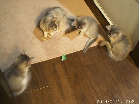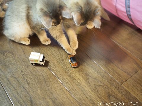 JUGEMテーマ:ソマリの子猫 今日は、飾り棚にあったミニカーを仔猫たちが床に落とし 遊んでいた姿がとても可愛かったので、 セリフを付けずに淡々と載せてゆこうと思います。 左から、水晶の手だけ、燕、雪倉。 同じく水晶、燕、雪倉。 同じく、水晶、燕、雪倉。 同じく、水晶、燕、雪倉。 向きが変わって、左上から雪倉、燕、水晶。 左から、雪倉、燕、水晶。 雪倉(左)と燕(右) 水晶、雪倉、燕。 こうやって3匹で遊べるのもあとちょっとです。 早いね。...