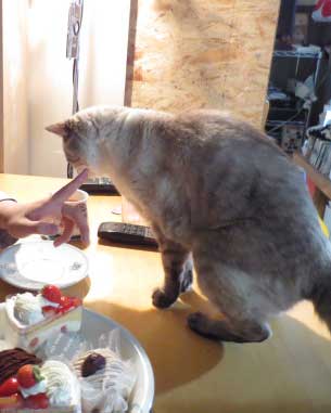 JUGEMテーマ:にゃんこ日記 ちょっとおそくになりましたが 息子くんのお誕生日のお祝いケーキを昨日皆で食べました。 そう・・・・もちろん2にゃんも参加 指につけてもらったクリームを少しだし・・・・鼻についてるヒト・・いるし・・・ ・・・・