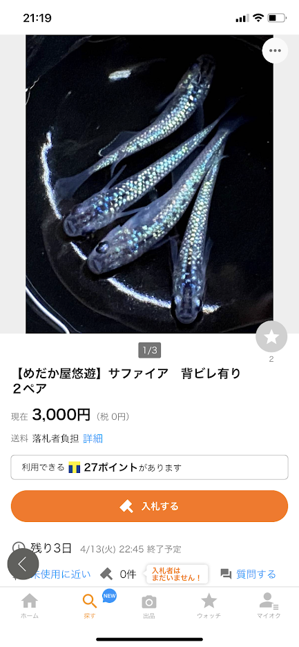 こんばんは、悠遊です。 サファイヤ、2ペア3000円出品で、入札ないな〜なんて思ってたんですが・・・ 昨日、やさしいお客様からメール頂き、サファイアです・・・ なんてイージーミス! ご指摘、感謝です。 で、出し直しましたw 明日も13時よりオープンなんですが、僕は、ブラインシュリンプを仕入れに行きますので、多分14時付近しか帰ってこれません。 たまに、僕に会いたいという変態さんがいらっしゃるので、一...