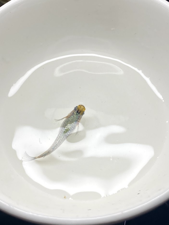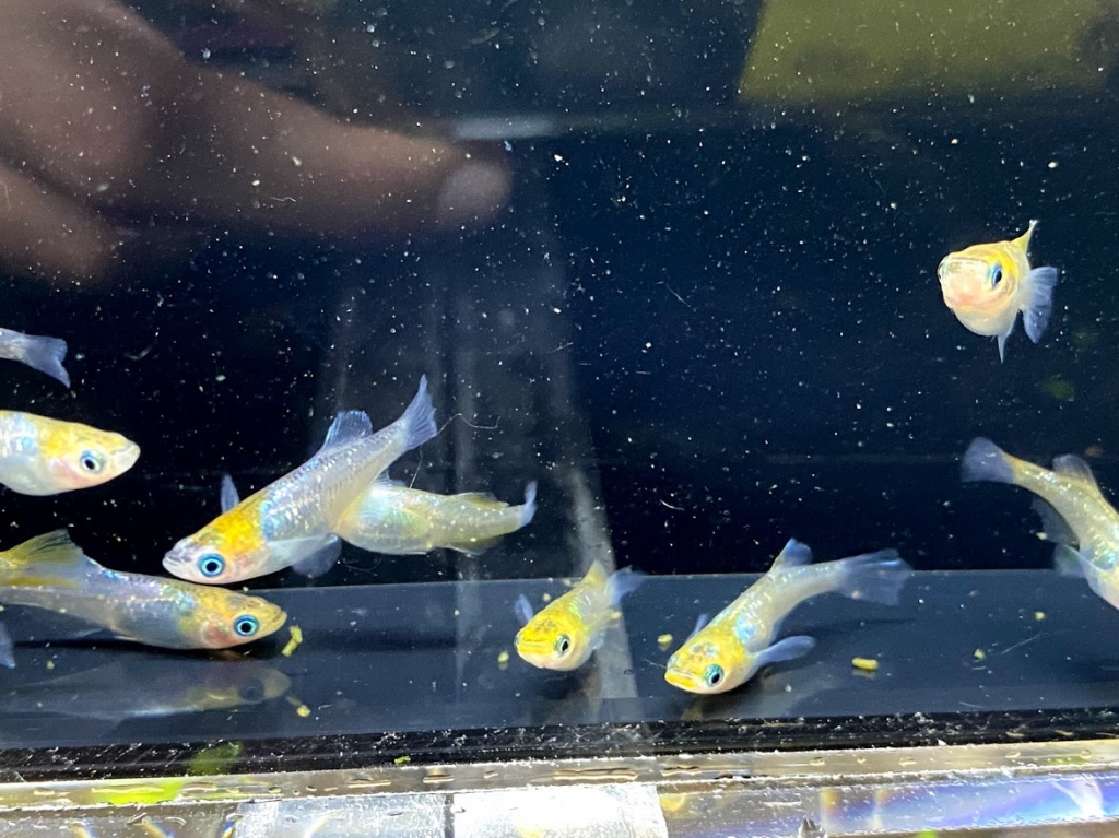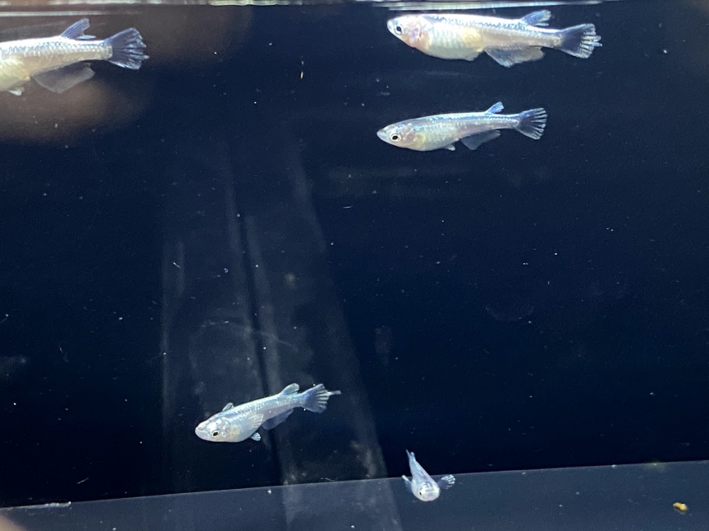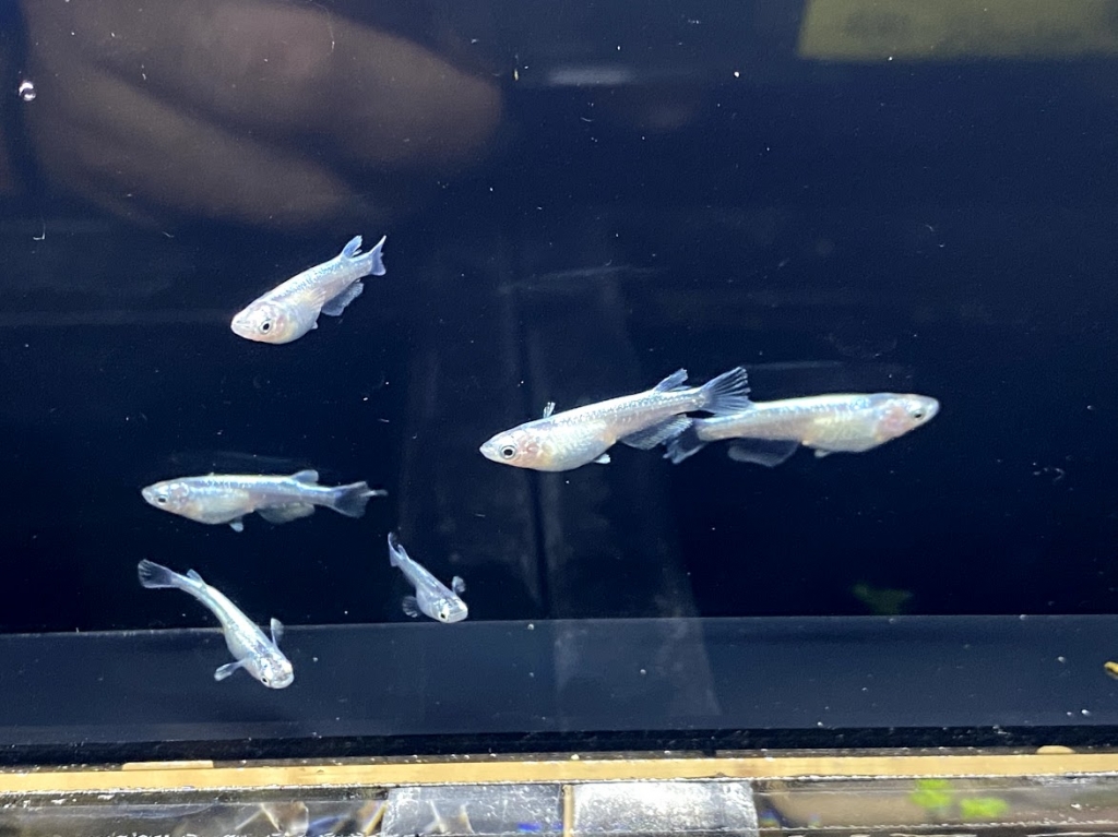 こんばんは、悠遊です。 今日は、若いめだか様が育ってきたので、撮ってみました。 少し大きめに育った個体を掬ってみたんですが、胸鰭量ヒレ光と尾鰭光は「すべてに遺伝しているようです。 ヒレ長は、ヒレ長どうしの交配ですので、固定されています。 オスでもしっかりと、全てのヒレに光が遺伝してくれています。 成長が楽しみだ〜(笑) 撮影容器は薄いので、遠近法は使えないんですが、サイズは まだまだ小さいです(笑) &nb...
