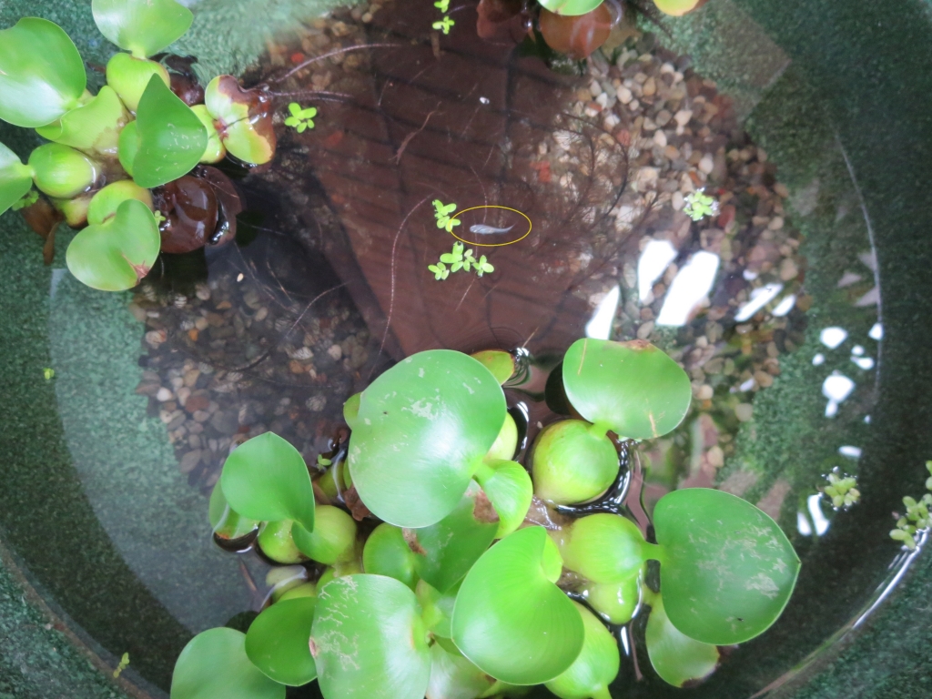 朝、事務所に行く時には、見えなかったか見過ごしていたのか分りませんが、夕方に帰宅しメダカに餌を遣りました。 その時に妻が、「未だメダカは孵化していないん」と。 なので私が、「あんたがこの前に、ホテイアオイの根に産卵したのを見つけてくれてから約1週間ほど経つけど、今朝は見えなかった」と。 すると妻曰く、「それなら孵化していないかどうか、私が確認してあげるから」と云って、水槽の置いてある所まで出て来ました。 私が、「ホテイアオイは此方の発砲スチロール...