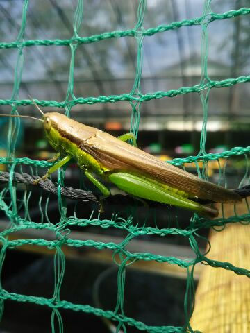 JUGEMテーマ:国産改良品種メダカ めだか販売店、小山メダカセンター店主のブログです。 メダカ用ハウスでイナゴを見つけました。 昔は近くの水田でも佃煮が作れるくらい沢山いましたが、最近は農業技術の発達に伴って少なくなったようです。 敷地内にイネは無かったはずですが…、何を食べて育ったのでしょうか?!